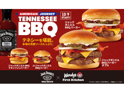ウェンディーズ・ジャパン株式会社及び、ファーストキッチン株式会社 (所在地:東京都新宿区、代表取締役:紫関修) では、10月9日(木)から、ウェンディーズ・ファーストキッチンにて、本格的なバーガーが楽しめる「アメリカンジャーニー※」の第3弾として「ジャックダニエルBBQバーガー」など、4品の新商品を発売します。アメリカのテネシーウイスキーの代表格「ジャックダニエル」を使用して作られた、独特でまろやかな味わいが特徴の芳醇なBBQソースが、100%ビーフパティやチキンの旨みをより引き立てます。また、アップルウッドで燻製したスモーキーなベーコンとの相性も抜群で、食欲の秋にぴったりな商品です。