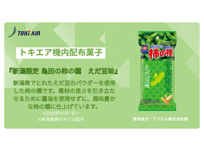 新潟拠点の地域航空会社トキエア株式会社(本社:新潟県新潟市 代表取締役:長谷川政樹、和田直希、以下トキエア)は2025年10月1日からの機内配布菓子についてお知らせいたします。今回ご提供するお菓子は「新潟限定 亀田の柿の種 えだ豆味」です。