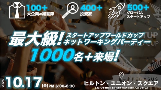 世界100以上の国と地域で予選が行われる、世界最大級のビジネス・ピッチコンテスト「スタートアップワールドカップ2025」世界決勝戦が、いよいよ2025年10月15日(水)から10月17日(金)まで米国サンフランシスコにて開催されます。その最終日となる世界決勝戦後にネットワーキングパーティーが盛大に行われます。
