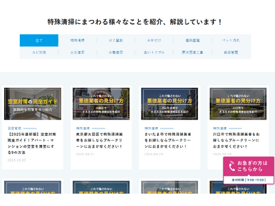 ペット汚れ」「カビ対策」「火災復旧」「水害復旧」「臭いトラブル」「原状回復工事」の6分野で新設。具体的な案件をもとに課題と解決プロセスを公開することで、透明性の高い情報提供を行い、読者にとって実用的かつ信頼できる知見をお届けします。