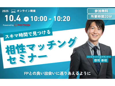 無料マネーセミナー提供サービス「アットセミナー」を運営しているパワープランニング株式会社が「10月4日(土) 10時」に「相性マッチングセミナー」というスキマ時間で自分に合ったFPを見つけられるオンラインセミナーを開催いたします。