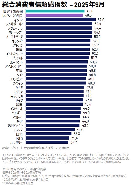 世界消費者信頼感指数は、調査対象となったすべての国の総合指数または「国家」指数の平均です。今月のレポートは、イプソスオンラインプラットフォームGlobal Advisorで30か国の75歳未満の21,000人以上を対象に実施された月次調査に基づいています。この調査は2025年8月22日から9月5日まで実施されました。