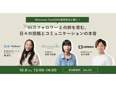 株式会社サザビーリーグアウルスケープ(本社:東京都渋谷区、代表取締役社長 相川 慎太郎、以下「アウルスケープ」)は、2025年10月9日(木)13:00~14:00に、「Afternoon Tea」のSNS運用事例を解説するウェビナーを株式会社コムニコとの共催で開催いたします。