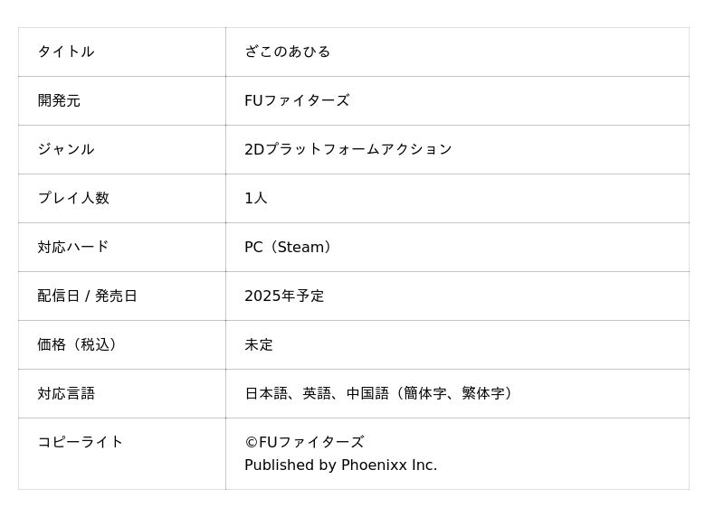 株式会社Phoenixx(フィーニックス)(東京都武蔵野市、代表取締役社長:坂本 和則)は、2Dプラットフォームアクションゲーム『ざこのあひる(ZAKO NO AHIRU)』について、2025年10月14日(火)~21日(火)にSteamにて開催される「Steam Next Fest」に参加することを発表いたします。