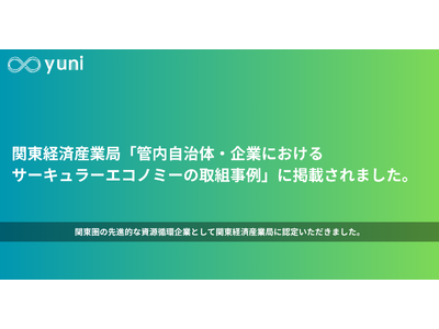 株式会社yuni(本社:東京都渋谷区、代表取締役CEO:内橋 堅志、以下「yuni」)は、経済産業省 関東経済産業局が作成した「管内自治体・企業におけるサーキュラーエコノミーの取組事例集」に掲載されたことをお知らせいたします。