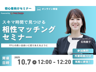 10月7日(火) 12時より、スキマ時間を活用して自分に合ったFPを探すことができる、石飛慶子講師との「相性マッチングセミナー(無料)」を開催いたします