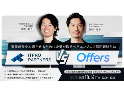 株式会社Hajimari(所在地:東京都渋谷区、代表取締役:木村 直人、以下 当社)は、ITエンジニアの採用に課題を抱える企業の経営層・人事部門向けウェビナー「事業成長を加速させるために企業が取るべきエンジニア採用戦略とは【ITプロパートナーズ VS Offers】」を、2025年10月14日(火)にライブ配信することをお知らせいたします。