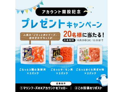 マリンフーズ株式会社(以下「マリンフーズ」)は、創立記念日である2025年10月6日(月)に、公式X(旧Twitter)アカウントを開設しました。アカウント開設を記念して、抽選で20名様に、マリンフーズ人気商品「ごろっと丼シリーズ」が当たるキャンペーンを実施します。
