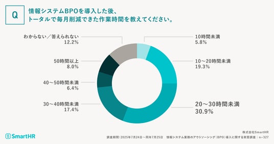 - 情報システムBPO(IT業務アウトソーシング)導入企業の62.7%が、「月20時間以上の工数削減」を実感