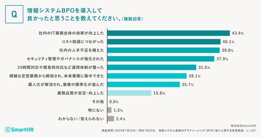 「情報システムBPOを導入して良かったと思うことを教えてください。(複数回答)」と質問したところ、「社内のIT業務全体の効率が向上した」が43.4%で最も多く、次いで「コスト削減につながった」が40.1%、「社内の人手不足を補えた」が39.8%という回答となりました。