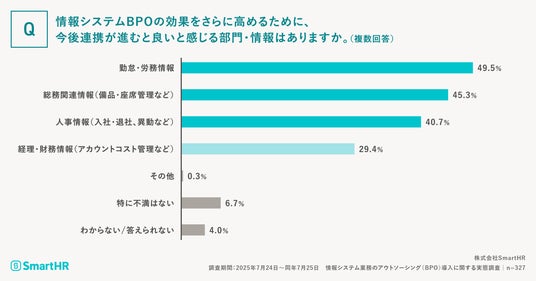 「情報システムBPOの効果をさらに高めるために、今後連携が進むと良いと感じる部門・情報はありますか。(複数回答)」と質問したところ、「勤怠・労務情報」が49.5%、「総務関連情報(備品・座席管理など)」が45.3%、「人事情報(入社・退社、異動など)」が40.7%という回答となりました。