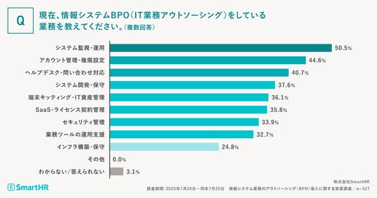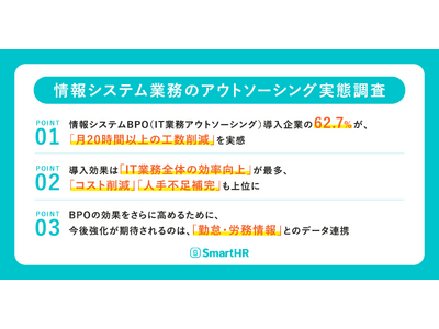クラウド人事労務ソフト「SmartHR」を運営する株式会社SmartHR(本社:東京都港区、代表取締役CEO:芹澤 雅人)は、情報システム業務の一部をアウトソーシング(BPO:ビジネス・プロセス・アウトソーシング)サービスに委託している企業の情報システム担当者327名を対象に、情報システムBPO(IT業務アウトソーシング)導入に関する実態調査を行いました。
