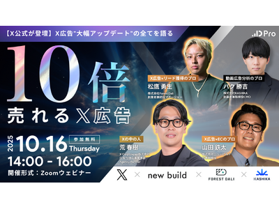 株式会社KASHIKA(本社:東京都大田区、代表取締役:小澤 健太)は、X Corp. Japan株式会社、株式会社ニュービルド、株式会社Forest Daliと共催で、X広告の成果最大化を目的とした無料オンラインセミナー「<公開勉強会!>10倍売れるX広告 ~X公式とトップ代理店が教える、X広告の勝ちパターン~」を2025年10月16日(木)に開催いたします。