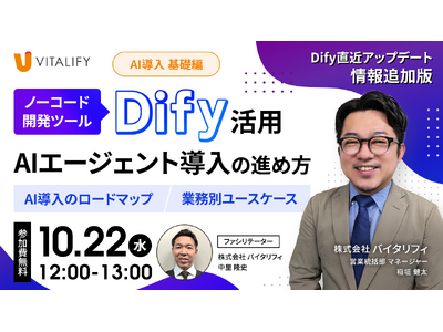 生成AIを活用したSaaSサービスの提供を行う株式会社バイタリフィ(東京都渋谷区、代表取締役:板羽晃司)は2025年10月22日(水)12:00に無料オンラインセミナー、「Dify直近アップデート情報追加版!Dify活用 AIエージェント導入の進め方<基礎編>」を開催致します。