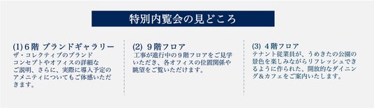 人気の窓側や使い勝手の良いサイズのお部屋は、オープン時にはその多くが契約で埋まってしまいます。オープン前にブランドコンセプトやアメニティをご体験いただきつつ、工事が進む現地にて実際のオフィスの位置関係や眺望をご覧いただける予約制の特別内覧会を実施中です。