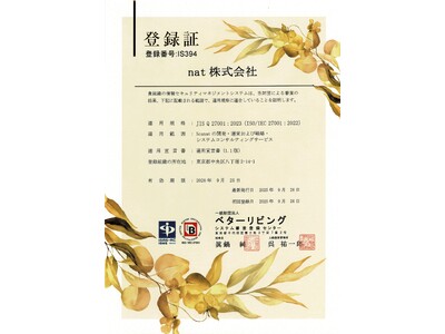 nat株式会社(本社:東京都中央区、代表取締役:劉 栄駿、以下 nat)は、情報セキュリティマネジメントシステム(ISMS)の国際規格である「JIS Q 27001:2023(ISO/IEC 27001:2022)」に基づく認証を2025年9月26日付で取得しましたことをお知らせいたします。