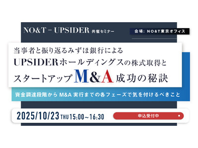 「挑戦者を支える世界的な金融プラットフォームを創る」をミッションとする株式会社UPSIDERホールディングス(代表取締役社長:宮城 徹、本社:東京都港区、以下 当社)は、2025年10月23日(木)15:00より、長島・大野・常松法律事務所と共同で、「当事者と振り返るみずほ銀行によるUPSIDERホールディングスの株式取得とスタートアップM&A成功の秘訣 ― 資金調達段階からM&A実行までの各フェーズで気を付けるべきこと」 と題した特別セミナーを開催いたします。