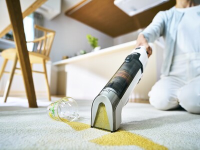 本製品は、カーペット・ラグ、布製品用のコードレスシミ取りクリーナーで、当社としてコードレスシミ取りクリーナーの日本での製品展開は本製品が初となります。ハンディ型なので、急な液体汚れでもサッと取ってサッと使えるのが特長です。パワフルなモーターで、汚れや水分が繊維に入り込む前にしっかり吸引します。