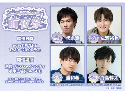 今回は、11月7日に実施が決定した「前夜祭」の詳細を発表! 代永翼さんがメインMCを、広瀬裕也さんがアシスタントMCを務め、翌日から始まる『アニメイトガールズフェスティバル2025』の企画紹介や、特別な景品がゲットできる大抽選会などを行います。