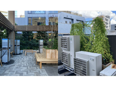 クールスポットでは、ダイキン工業株式会社の屋外エアコン「アウタータワー」やミスト等を組み合わせて設置し、熱中症予防のための指標である暑さ指数(WBGT値)の低下を図るとともに、屋外を冷やす理想的な方法や、利用者の滞留性、行動の変化を分析します。クールスポットは、用途や利用者層の異なる複数の場所に導入することで、より効果的な設置場所も検証します。また、渋谷公園通商店街振興組合の協力の下、特定のビルの屋上にて芋緑化※1等を行うことで、室外機近辺の温度上昇を防ぎ、ヒートアイランド現象の抑制を図ります。さらに、緑化による空調機の運転効率の改善や、データ活用による空調の省エネ運用の電力削減効果を検証、クールスポットによる電力消費増の相殺に挑戦し、環境負荷を増やさずに、街なかのクールダウンを推進します。