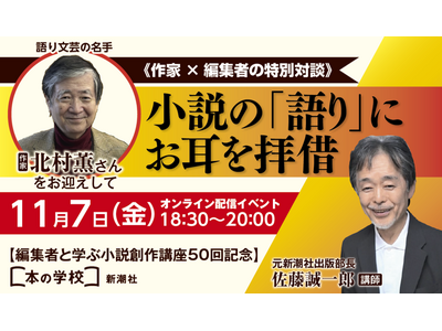 本イベントは、そんな佐藤講師によるオンラインでの最終講義です。これまではアーカイブ動画講義のスタイルで、小説技法から文章術、プロットの活かし方まで幅広く小説創作のヒントをご提案してきましたが、記念すべき第50回は、語り文芸の名手である作家の北村薫さんをゲストにお迎えし、リアルタイムのライブ配信でお届けします。