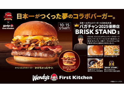ウェンディーズ・ジャパン株式会社及び、ファーストキッチン株式会社 (所在地:東京都新宿区、代表取締役:紫関修) では、10月15日(水)から、ウェンディーズ・ファーストキッチンにて、JAPAN BURGER CHAMPIONSHIP (グルメバーガー日本一決定戦)で優勝した「BRISK STAND」とのコラボバーガー“かけちゃったやつ”を発売します。ウェンディーズの特徴である四角いジューシーなビーフ100%パティ、看板商品ベーコネーターUSAでも使用しているプリクックドベーコンをベースに、素材を生かすために、「BRISK STAND」が監修しました。水を使用せず牛乳のみで仕上げる全粒粉と小麦粉の絶妙な配合のバンズ。「JAPAN BURGER CHAMPIONSHIP」の本大会でも指定食材となった「リアル カリフォルニア ミルク」認証のナチュラルチーズ3種類をブレンドしたシュレッドチーズ。旬な食材でもある舞茸は、店舗で丁寧にグリルすることで生まれる味わい。厳選されたかけしょうゆを加えることで、「BRISK STAND」の特徴でもある「和」を生みます。今しか食べることなのできない、「日本一」が監修したコラボバーガー“かけちゃったやつ”を、ぜひご堪能ください。