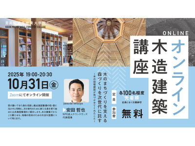 建築家・隈研吾氏が校長を務める高知県立林業大学校(高知県香美市)は、木造建築について学ぶオンライン講座(主催:高知県立林業大学校、後援:公益社団法人 日本建築士会連合会/一般社団法人 高知県木材協会)を開催いたします。各回異なるテーマ・講師による、全3回の公開講義です。本リリースでは、第2回目の講義についてお知らせいたします。建築実務者だけでなく、建築を学ぶ学生や森林・林業関係者など、木造建築に関心をお持ちのみなさまのご参加をお待ちしております。中大規模建築物の木造化が確実に広がりつつある中で、これからの木造建築への理解を深める本講座を是非ご活用ください。