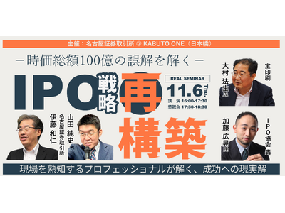 IPOの無限の可能性を唱える「IPO協会 轟」代表の加藤広晃が、11月6日(木)16:00~株式会社名古屋証券取引所 主催、宝印刷株式会社/IPO協会 轟 一般社団法人/株式会社オービックビジネスコンサルタント 共催、三菱UFJ信託銀行株式会社 後援で「時価総額100億の誤解を解く、IPO戦略 再構築~現場を熟知するプロフェッショナルが解く、成功への現実解~セミナー」を開催いたします。