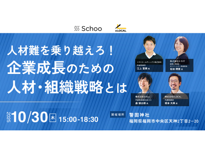 インターネットでの学びや教育を起点とした社会変革を行う株式会社Schoo(本社:東京都渋谷区、代表取締役社長CEO:森健志郎、以下「スクー」)は、都市から地方への人材流入を促進し、地方企業が専門性の高い複業プロ人材を採用する地方特化型のダイレクトスカウトサービス「チイキズカン」を運営する株式会社XLOCAL(本社:山形県鶴岡市、代表取締役:坂本大典、以下「XLOCAL」)と共同で、「地方における人材難を乗り越え、企業を成長させるための人材・組織戦略のためのイベント」を福岡県福岡市で10月30日(木)に開催します。