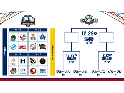 12月26日から明治神宮野球場と横浜スタジアムで開催されます「NPBジュニアトーナメント KONAMI CUP 2025」の対戦カードが決定しましたのでお知らせいたします。今大会は、4チームずつ、4グループに分かれてリーグ総当たり戦を行い、各グループの1位が決勝トーナメントに進出します。