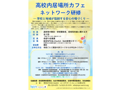 本研修では、「高校教員と若者支援団体が共に学び合い、つながり合うこと」「居場所カフェの意義や実践方法を共有すること」「教員・支援者間のネットワークを形成すること」を目的とし、将来的に宮城県内高校において「高校内居場所カフェ」が、持続的に展開される基盤を築くことを目指します