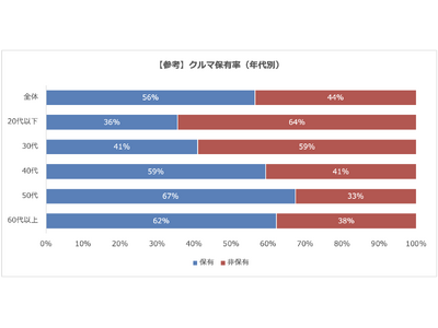 今回の調査では、クルマを保有している人は56%、保有していない人は44%となりました。年代別のクルマの保有率は以下の通りです。
