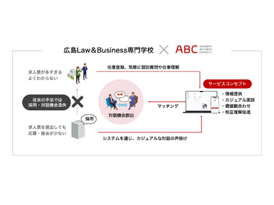 当社が運営する「ABC」を通じ、地域の採用企業は広島Law&Business専門学校に所属する学生にダイレクトに声をかけることができます。既存の採用プロセスでは、企業と学生の接点は就職・採用を前提としており、密なコミュニケーション醸成に課題がありました。本協定では、情報提供やカジュアル面談の呼びかけと、早期対話機会の創出を目的としており、学生と企業の相互理解と地元就職のマッチング促進を目指しています。