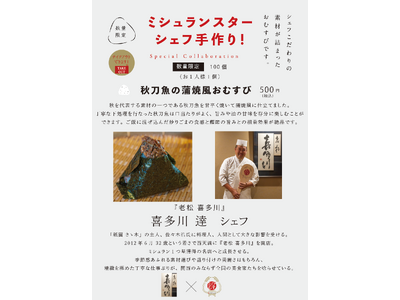 今月の夢のコラボキャンペーンは、『老松 喜多川』(西天満)喜多川 逹シェフが調理した「秋刀魚の蒲焼風おむすび」です。