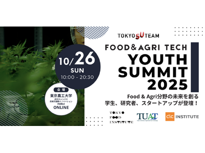 食の未来を考え、新しい事業構築・人材育成、さらには社会の多様なアクターの共創によるエコシステム構築を目指す一般社団法人TOKYO FOOD INSTITUTE(所在地:東京都中央区、代表理事:沢 俊和、以下「TFI」)と、政府や地方自治体、大学などと連携しエコシステムの発展やイノベーションを通じた経済発展に貢献するCIC Institute(所在地:東京都港区、創業者兼CEO:ティム・ロウ)は、東京農工大学と協働し、2025年10月26日(日)、全国の大学生を対象に、食と農業の未来を担う起業家人材を発掘・育成することを目的として「FOOD&AGRI FOODTECH Youth Summit 2025」を初開催いたします。