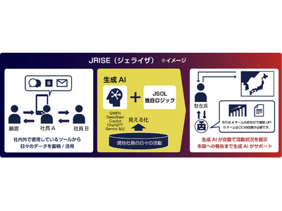 株式会社JSOL(本社:東京都千代田区、代表取締役社長:永井 健志 以下、JSOL)は、日系企業の海外法人向けに、現地マネジメント支援と業務効率化を同時に実現する新システム「JRISE(ジェライザ)(TM)」の提供を10月13日より開始します。本システムは、特許出願中のJSOL独自技術を搭載し、現地スタッフが普段使用しているコミュニケーションツール内の情報を生成AIによって業務報告形式にまとめます。これにより、駐在員や経営層がビジネスの進展状況をリアルタイムで把握することが可能になり、適切な意思決定を迅速に行えるようになります。また、現地スタッフにとっては業務報告の負荷が軽減され、営業活動など主軸の業務に注力することが可能となります。本システムは、中国・上海地区を皮切りに、中国全土への展開を図るとともに、将来的にはアジア太平洋地域を中心とする世界市場への展開を目指します。