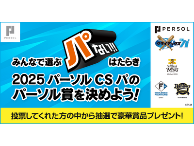 パシフィックリーグマーケティング株式会社(本社:東京都港区、代表取締役CEO:新井 仁)は、2025年度パシフィック・リーグタイトルパートナーであり、クライマックスシリーズ パ協賛社である総合人材サービスのパーソルホールディングス株式会社(本社:東京都港区、代表取締役社長 CEO:和田 孝雄)が「2025 パーソル クライマックスシリーズ パ」のパーソル賞をファン投票で決定し、抽選で豪華賞品が当たるキャンペーンを実施することをご案内いたします。