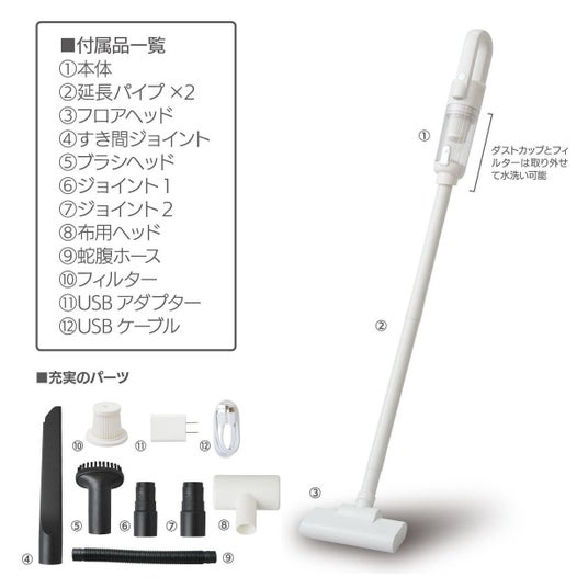 「充電式軽量 スマートクリーナー」は、充電式のコードレスタイプで、場所を選ばず使用できます!充電口は専用のジャックではなく、USBタイプC!もちろん、アダプタと約1mのコードもついています♪