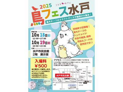 「小鳥たちを眺めながら、まったりコーヒータイム♪」をコンセプトにした「ことりカフェ上野本店」(http://kotoricafe.jp/)を運営する株式会社ことりカフェ(本社:東京都台東区 代表取締役 川部志穂)は、今週末の10月18日(土)・10月19(日)に、水戸市民会館(品格ある芸術・文化・建築の歴史を継承し、 上質な空間づくりで街のシンボルに水戸の新たな文化とにぎわいの発信地)(https://www.mito-hall.jp/)2階 展示場にて、“鳥好きによる鳥好きのためのフェスタ”第1回「鳥フェス水戸2025」(主催:ことりカフェ)を開催いたします。全国から人気クリエイターが集合し、色とりどりの小鳥モチーフの作品を対面販売。CAP!(ドリームバード)による小鳥のご飯や飼育用品も販売します。鳥さんのおもちゃ作家様も参加されますので愛鳥さんのお土産選びもご満足いただけます。