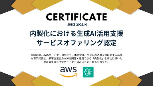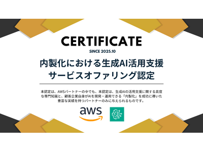Ragate(ラーゲイト)株式会社(以下、ラーゲイト)は、アマゾン ウェブ サービス ジャパン合同会社(以下、AWS Japan)が2025年10月09日に発表した「内製化における生成AI活用支援サービスオファリング」に認定されたことをお知らせいたします。