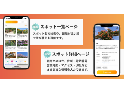 スポット詳細ページの追加(新機能) スポットごとに、紹介文のほか、住所・電話番号・営業時間・アクセス・URLなど、イベント参加者が必要とする情報を詳しく表示できるようになりました。