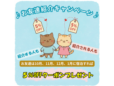 お友達をご紹介いただいた方には、紹介したお友達のご宿泊完了後、施設にご連絡いただくことで、次回のご予約時に使える最大10%OFFの特別割引クーポンを進呈いたします。