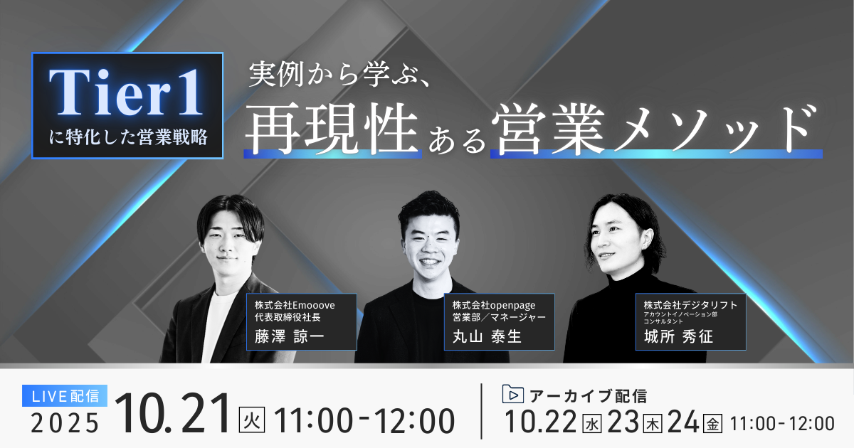 新時代の営業手法を提案する株式会社Emooove(本社:東京都渋谷区、代表取締役CEO:藤澤諒一)は、『Tier1に特化した営業戦略 実例から学ぶ、再現性ある営業メソッド』を2025年10月21日(火)11時から12時にオンラインで開催することをお知らせします。