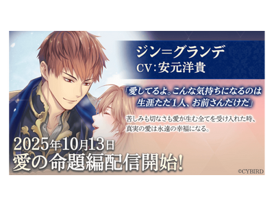 株式会社サイバード(本社:東京都品川区、代表取締役社長 兼 CEO 長嶋 貴之)が手掛ける、累計会員数4,500万人を誇る大人気恋愛ゲーム「イケメンシリーズ」の人気作『イケメン王子 美女と野獣の最後の恋』(以下、『イケメン王子』)は、「ジン=グランデ (CV:安元 洋貴)」(以下、「ジン=グランデ」)の愛の命題編を、2025年10月13日(月)より配信開始しました。また、愛の命題編配信を記念した様々なイベントを実施します。
