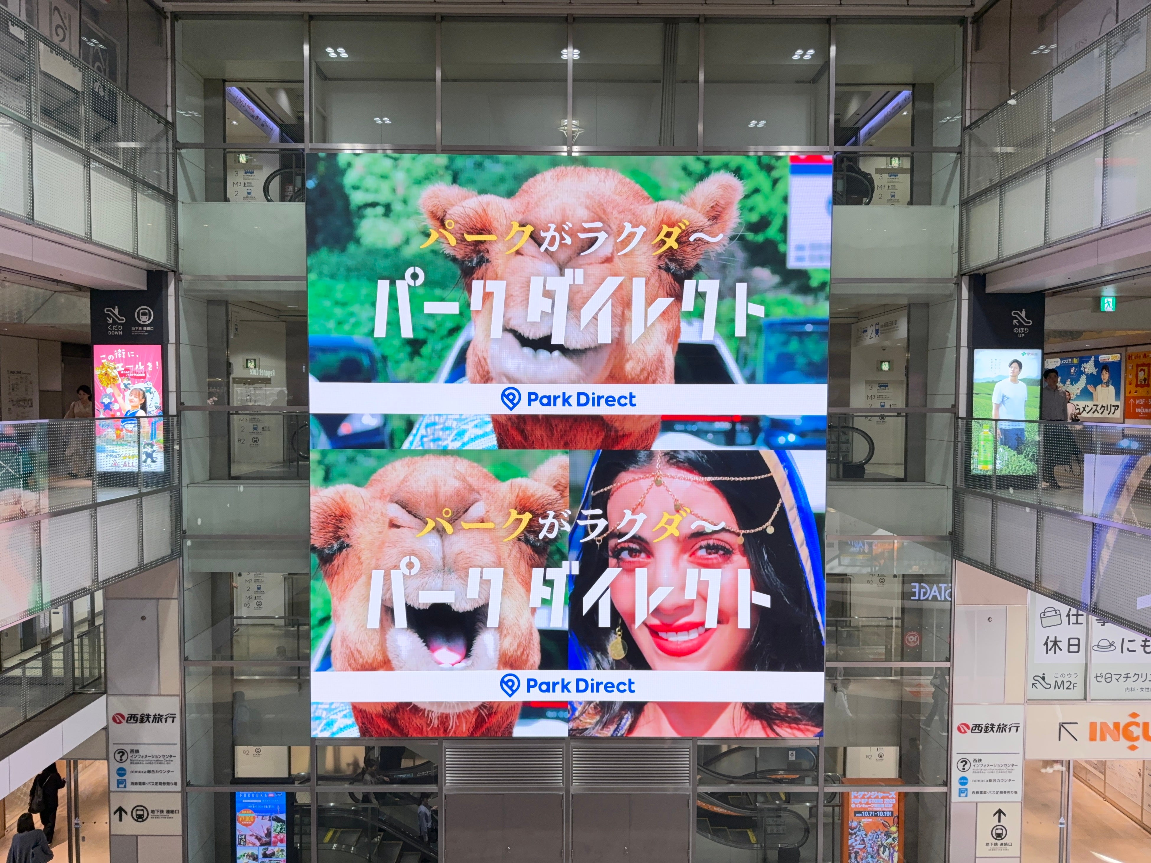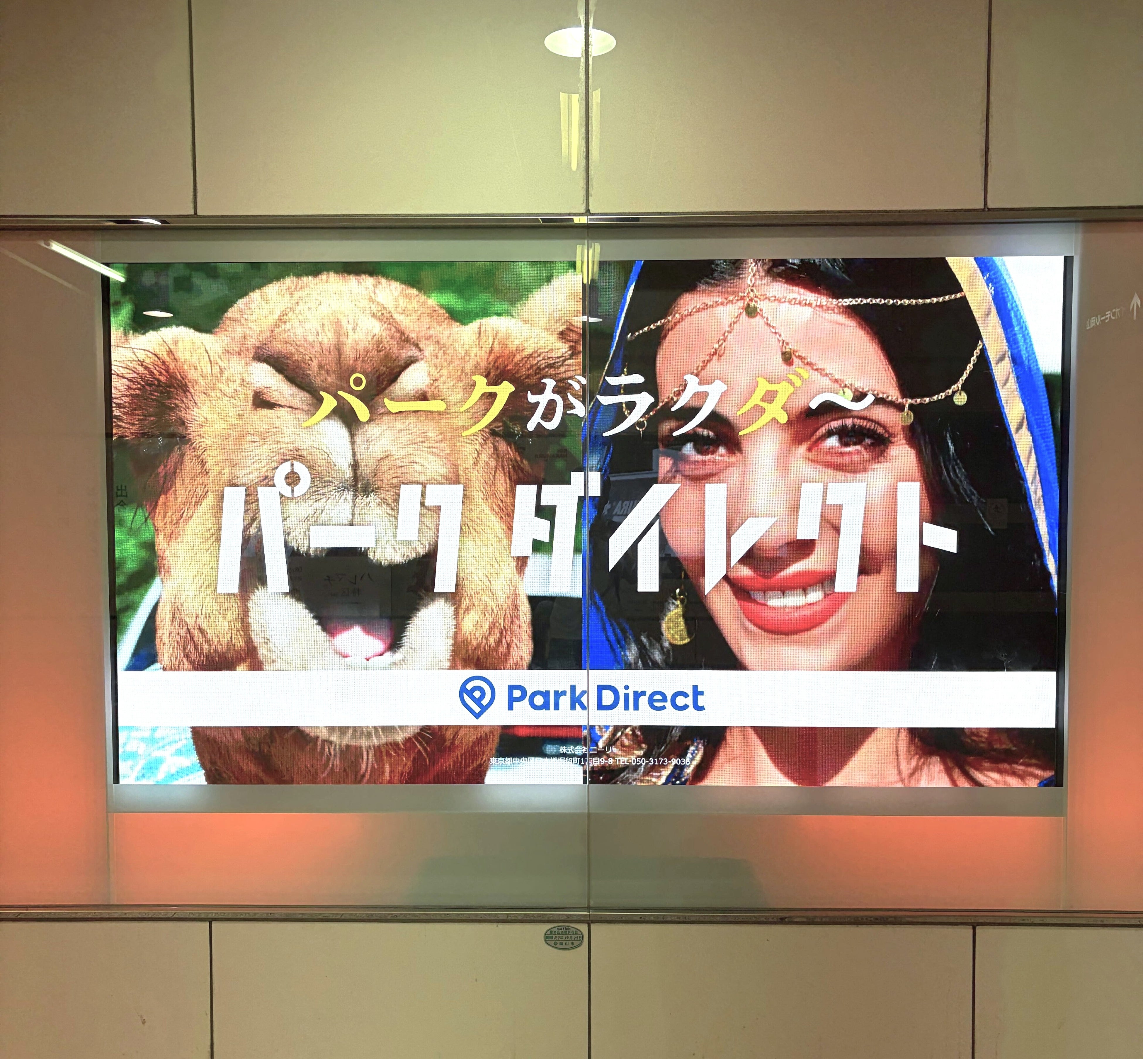 パークダイレクト のカラーである “青” を基調とした布を背中に掛け、砂漠の国から“車両”として来日したラクダが首から日本のナンバープレートを下げ、月極駐車場に座って「駐ラクダ」している強烈なインパクトのCMです。ラクダの持ち主である“女性(=ドライバー)”も登場し、スマホで月極駐車場が契約できて喜び踊っています。