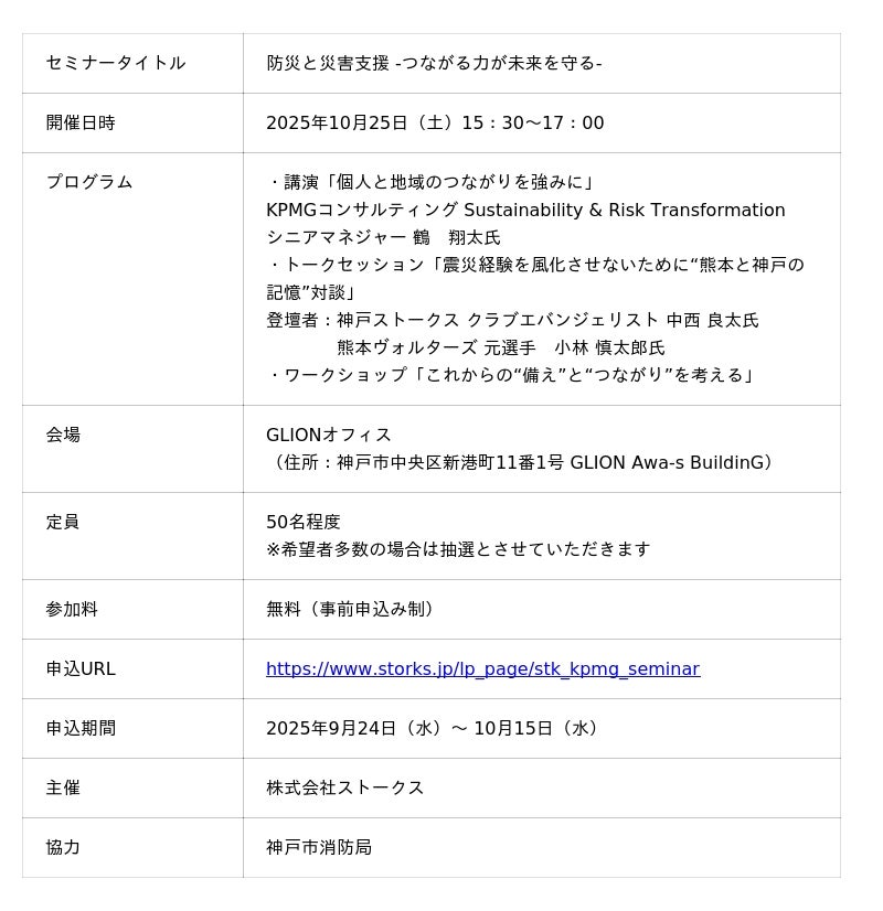 なお、同セミナーは、2025年10月から神戸ストークスのホームゲーム開催日に合わせ5回実施し、神戸ストークス関係者や各テーマに専門的知見を持つKPMGコンサルティングのプロフェッショナルなどが講師として登壇するほか、地域社会が抱える課題を自分事として捉え、行動へ移すことを目指したプログラムを実施する予定です。
