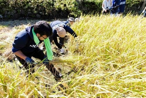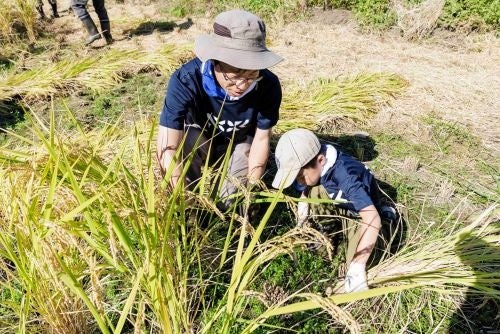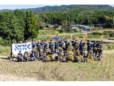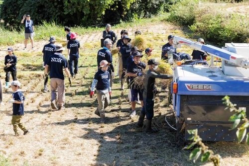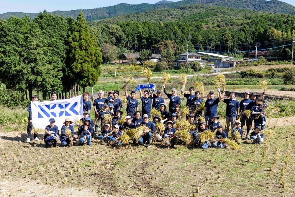 NOK株式会社(本社:東京都港区芝大門、代表取締役 社長執行役員 グループCEO:鶴 正雄、以下「NOK」)は、地域の地下水の保全活動の一環として、公益財団法人 くまもと地下水財団が実施する「水田オーナー制度」に2019年から7年連続で協賛し、参画しています。10月11日(土)にNOK熊本事業場(熊本県阿蘇市)の社員とその家族計50人が、オーナーである熊本県菊池郡大津町の水田で、地域の生産者の皆様と共に稲刈りを行い、6月に植えた稲からお米を収穫しました。