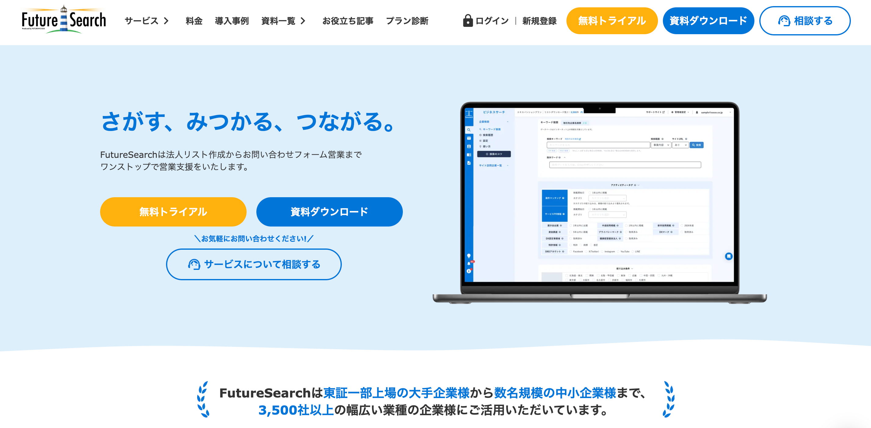 「FutureSearch」は、営業リスト作成からお問い合わせフォーム営業まで一貫して行うことができる、新規アポイント獲得支援ツールです。