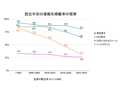 設立年が新しい企業ほど、従来型のコンタクト手段の掲載率が著しく低下しています。