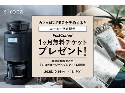 シロカ株式会社(東京都・千代田区)は、シロカオンラインストアや各家電量販店にて、11月20日発売の「コーン式全自動コーヒーメーカー カフェばこPRO」をご予約いただいた方全員に、コーヒーのサブスクリプションサービス「PostCoffee(ポストコーヒー)」のコーヒー豆定期便が1か月無料でお試しいただけるチケットをプレゼントする、予約特典キャンペーンを実施します。